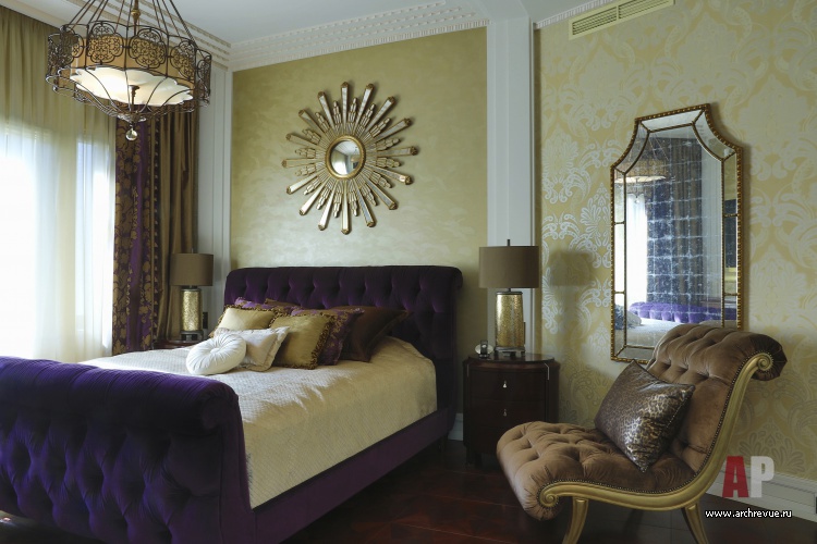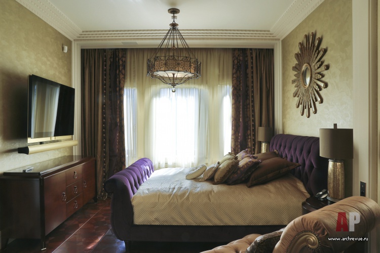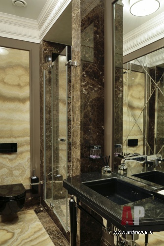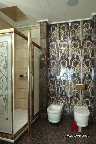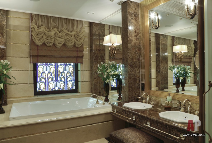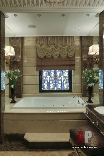 Природный камень, индивидуальные изделия из темного дерева, полы из экзотической древесины, выразительные светильники от Fine Art Lamps – все детали работают на образ парадного интерьера. На приватной половине особое внимание привлекает оформление хозяйской ванной комнаты, а точнее – авторская мозаика с изображением фонтана, который рассыпается сотней золотых брызг. С ним гармонирует цветной художественный витраж, закрывающий фасадное окно.