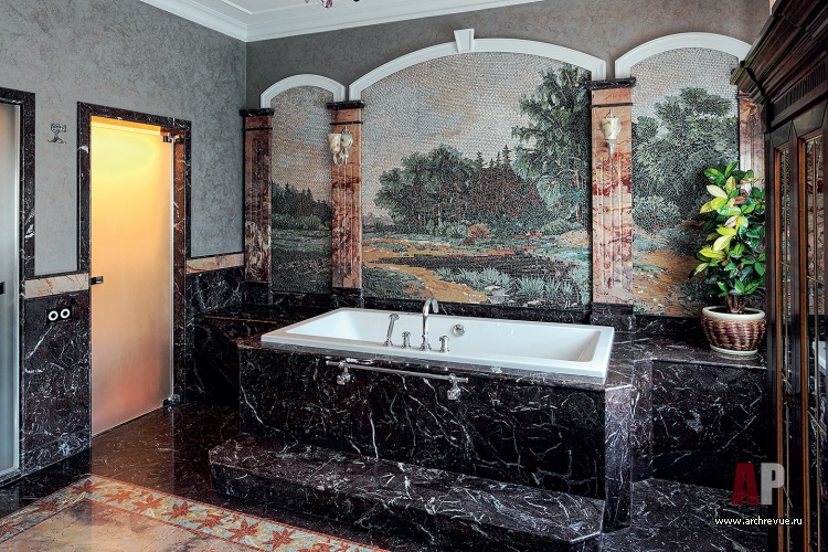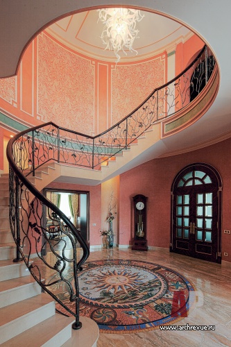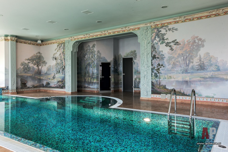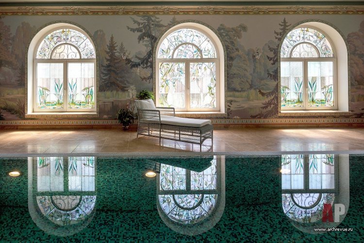 Так, в едином пространстве уживается роспись с изображением сказочных лесов Средней полосы и итальянская декоративная штукатурка, имитирующая камень, и каменные полы, характерные для французских замков. При входе в дом поражает необыкновенной красоты мозаика на полу, будто сошедшая со страниц книг о славянской живописи, солнечным лучам мозаики вторит люстра, а ажурная ковка лестницы ассоциируется со сказочным лесом. Это ощущение усиливает роспись стен в бассейне и авторские витражи.