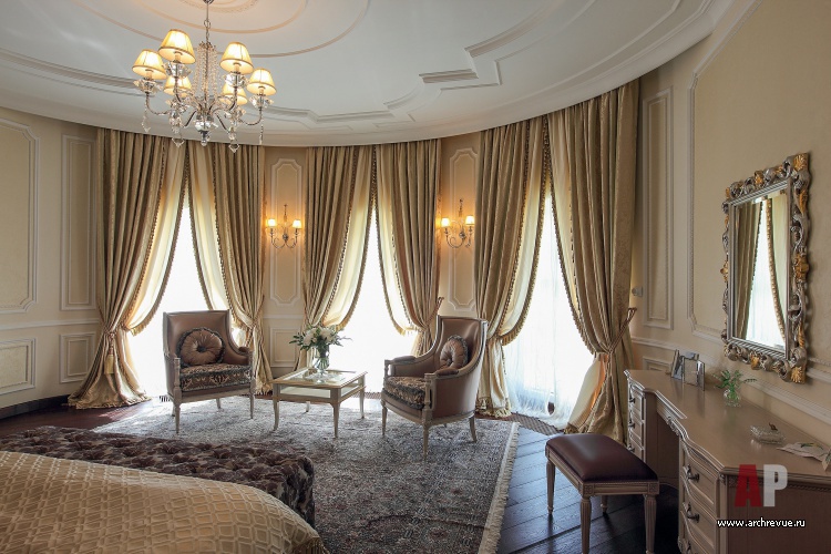 Центральный элемент большого дома – лестничный холл со вторым светом и роскошной винтовой лестницей с ажурным кованым ограждением. Гостевая часть первого этажа решена по принципу перетекающих пространств с открытыми арочными проемами: они связывают гостиную, столовую, кухню. Приватные помещения включают в себя спальни, кабинет-библиотеку и ванные комнаты с гардеробными.