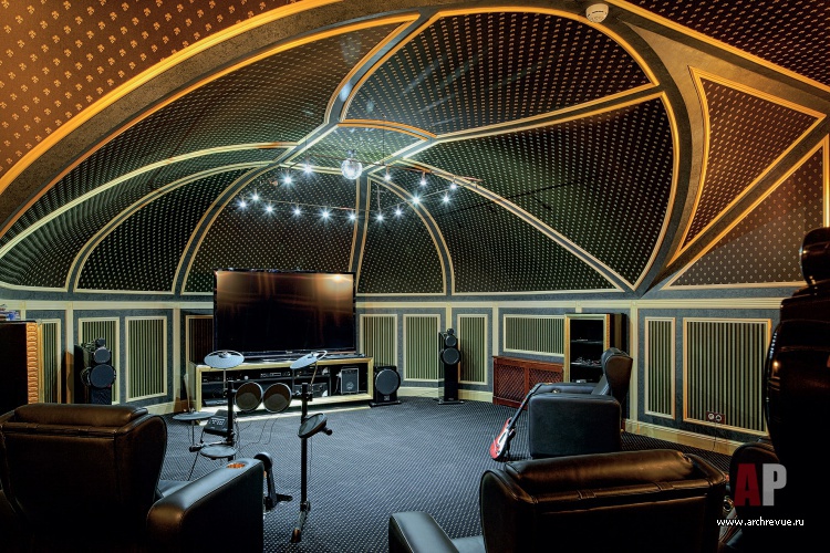 Отдельным блоком выделены пространства для отдыха и развлечений: домашний кинозал с профессиональной акустикой и шатровым потолком, винный погреб с деревянной былинной мебелью и огромный бассейн с арочными окнами, украшенными витражами.