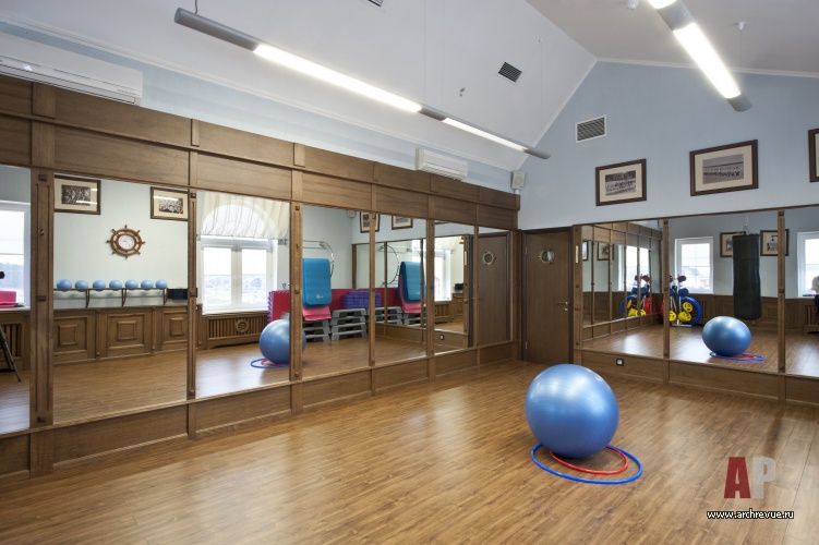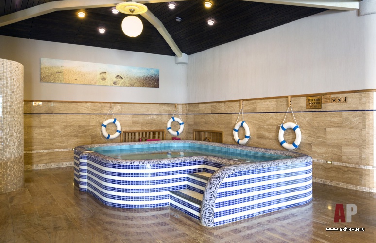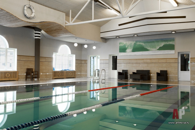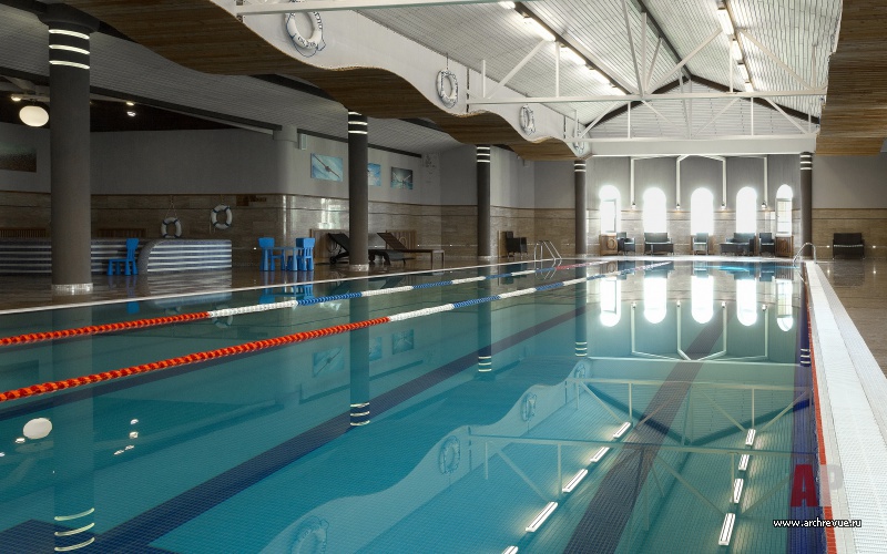 Спортивный центр с крытым плавательным бассейном входит в состав комплекса коттеджных поселков «Капитан Клаб». В основу концепции оформления оздоровительного комплекса, как и всех построек на территории, легла морская тематика, поданная с легкостью и большим вкусом.