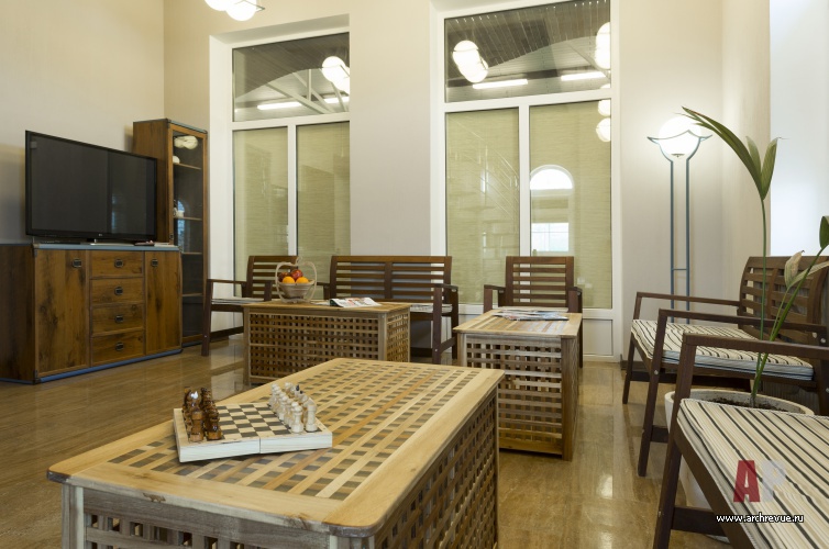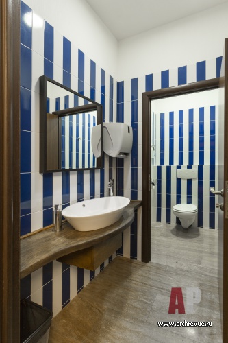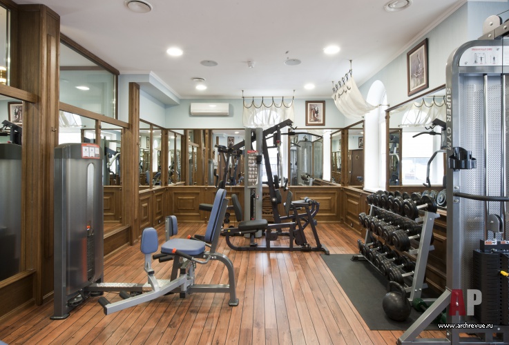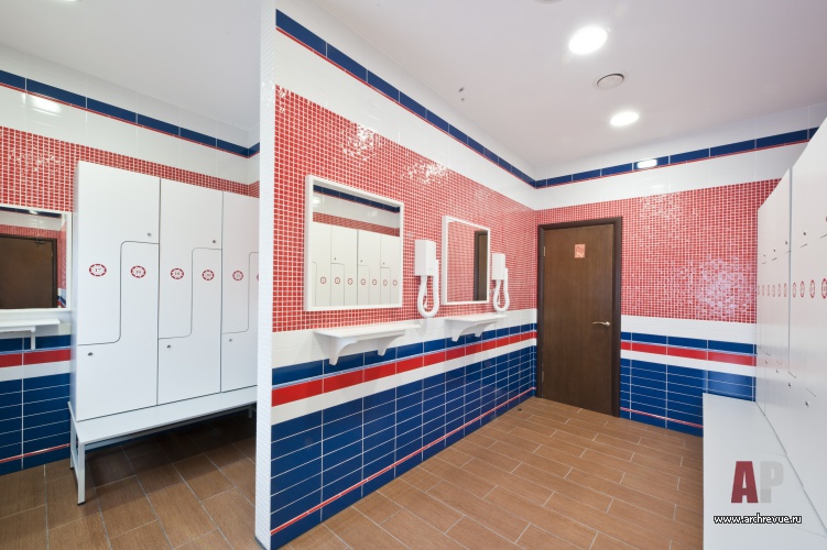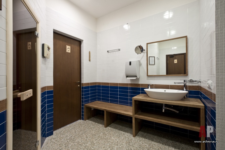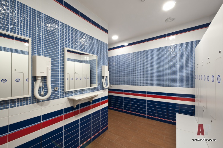 Интерьеры спортивного комплекса оформлены в морском стиле. Именно поэтому в отделке преобладают синий и голубой цвета и фирменная морская полоска. Респектабельный вид интерьерам придают изделия из дерева, преимущественно темного: стеновые панели, обшивка бара, декоративные балки, двери, плинтусы, карнизы – они выгодно оттеняют демократичную морскую тему.