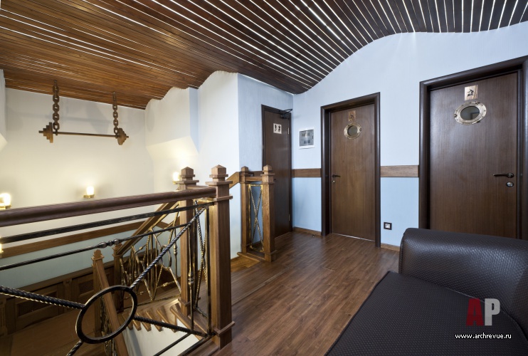 Благодаря кованому ограждению лестницы в виде морских канатов, шторам-парусам, окнам-иллюминаторам, металлическим светильникам интерьер выглядит необычайно декоративным.