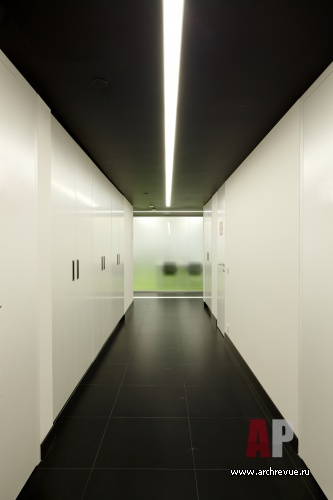 Интерьер офиса во многом был продиктован конструктивными просчетами при строительстве здания. Большое количество инженерных коммуникаций и беспрецедентно низкие потолки (всего 2,2 м) буквально не оставили архитекторам выбора. Так появился черный потолок, который вместе с темным полом не позволяют посетителям почувствовать реальную высоту. Этому же служит и обшивка потолка входной группы специальным пропускающим свет полотном, который отражается в глянцевом полу.