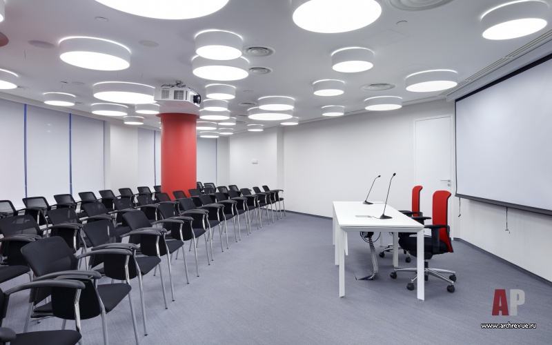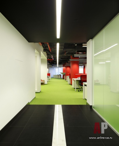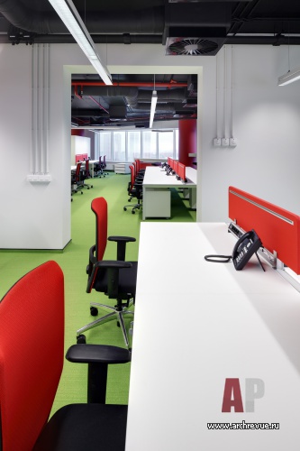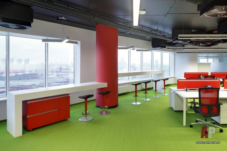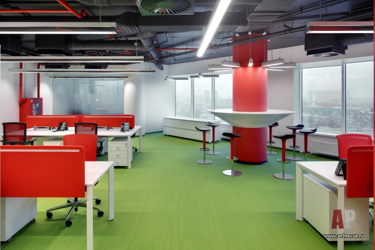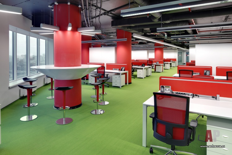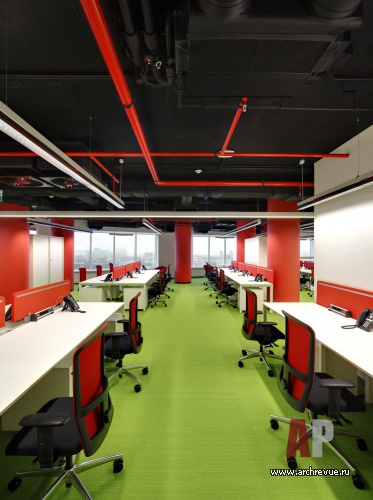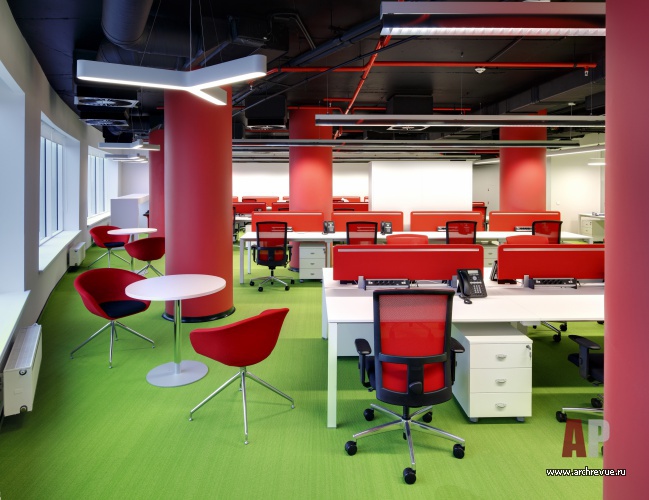 В красном корпоративном цвете решены колонны и трубы инженерных систем под потолком, а также мебель.
