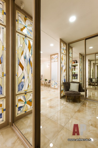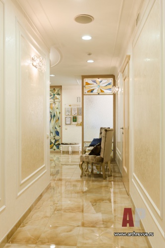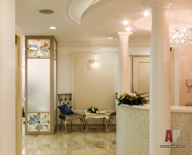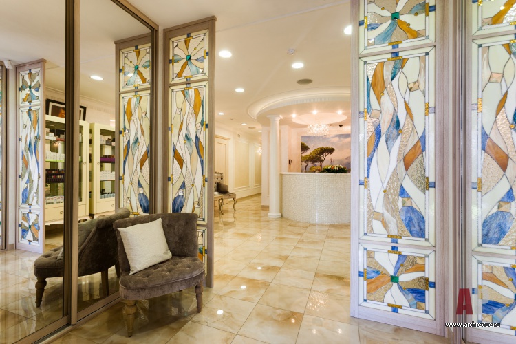 При работе над проектом салона красоты «Астериас» перед дизайнером Марией Абрамовой была поставлена задача создать парадный интерьер в классической стилистике. В качестве художественной доминанты были выбраны авторские витражи из цветного стекла, которые зонируют пространство, а также теплая цветовая гамма, которая создает ощущение солнечного дня.