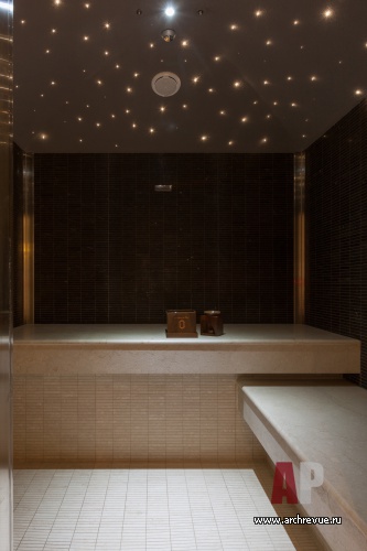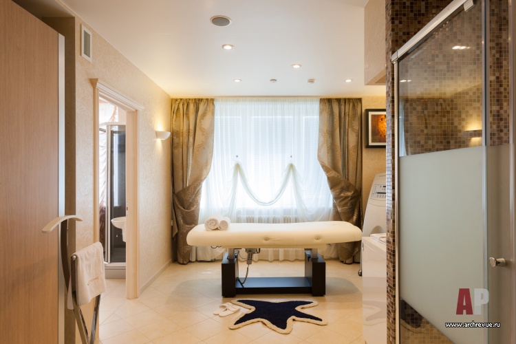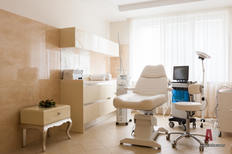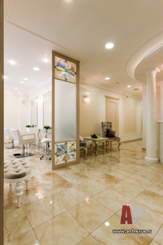 Салон красоты занимает 210 кв. метров и включает в себя помещения разного назначения. Ядро пространства – входная группа с полукруглой стойкой ресепшен и зоной ожидания. Парикмахерский зал на три рабочих места отделен от парадного входа витражными перегородками. Косметологический кабинет, массажный кабинет, а также комплекс помещений SPA (хаммам, душевые с массажем), изолированы от центрального блока и расположены в глубине пространства.