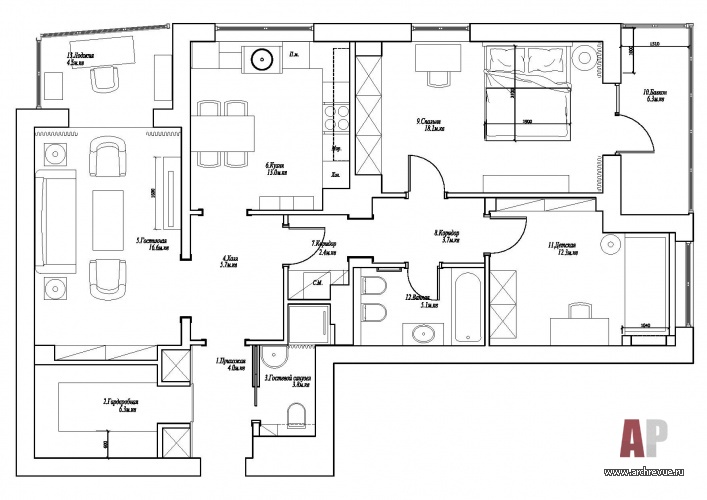 Из-за наличия несущей стены, разделяющей кухню и гостиную, возможности перепланировки были ограничены, поэтому перепланировка в трехкомнатной квартире была выполнена только в зонах спальни и детской. Пространство имеет логичную организацию: сразу при входе расположена гардеробная и гостевой санузел. Слева от входной группы расположена гостиная с присоединенным балконом (где размещена зона кабинета), на одной оси с прихожей находится изолированная кухня с раковиной у окна.