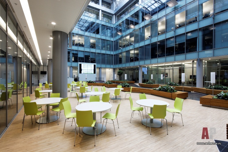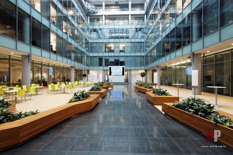 Московский офис корпорации Siemens расположен в современном 6-этажном здании с двухуровневой подземной парковкой в самом центре Москвы, на Большой Татарской улице. При работе над его интерьерами следовало, с одной стороны, соблюсти все нормы жесткого корпоративного стиля, а с другой – избежать стандартных решений. Центральный архитектурный элемент пространства – роскошный световой атриум с внутренними стеклянными фасадами рабочих зон, именно вокруг него архитекторы бюро ABD Architects построили концепцию оформления интерьеров.