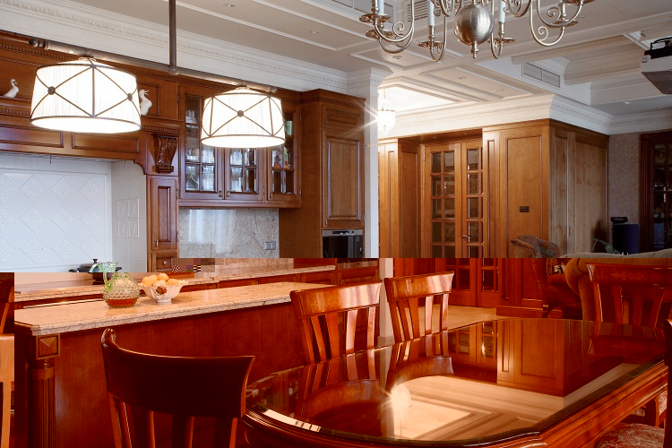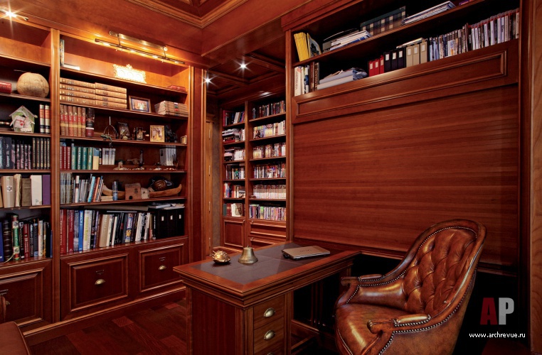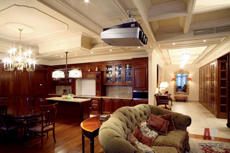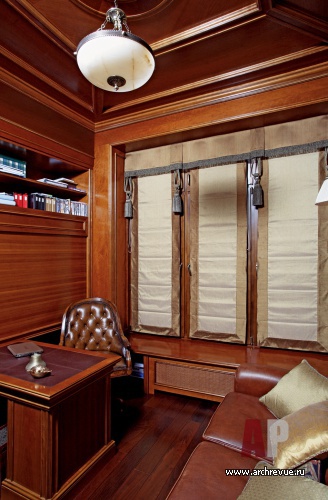Интерьер с английским корнями построен на использовании темных плотных цветов и поглощающих свет фактур. Особе настроение создают рельефные потолки с кессонами из гипса и дерева. Глубокие кессоны потолка с состаренным финишным эффектом на гипсе скрывают воздуховоды и систему кондиционирования. С темным деревом встроенных шкафов, стеновых панелей и полов контрастирует светлый мрамор и белая керамическая плитка в отделке кухни. Каменный портал дровяного камина изготовлен по чертежам авторов.