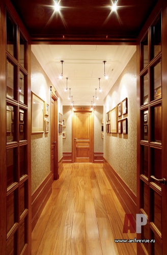 Для поклонницы английских интерьеров архитекторы создали квартиру с британским характером. В ее облике соединились черты традиционного английского дома (с его основательностью, тяжеловесностью и чопорностью) и современного жилья, отражающего ритм сегодняшней жизни. Классическая декорация создается с помощью панелей и шкафов из темного дерева, кессонированных потолков с отделкой из гипса и дерева, завышенных плинтусов и натуральных шерстяных тканей.