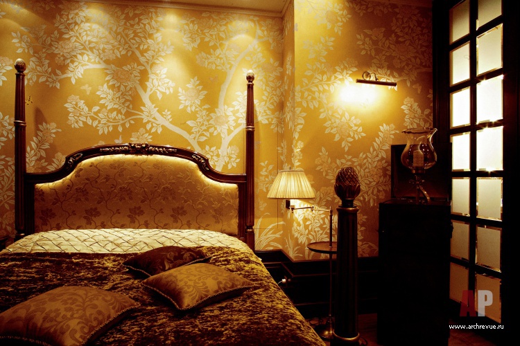 Монохромный интерьер усложняет трафаретная роспись в отделке стен за камином и обрамлении венецианского зеркала. Если кабинет выполнен в классической английской манере, то в декоре спальни заметны колониальные мотивы.