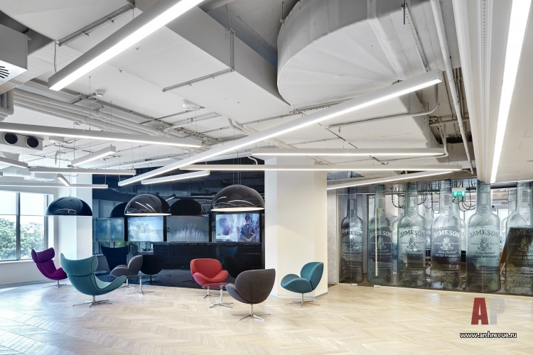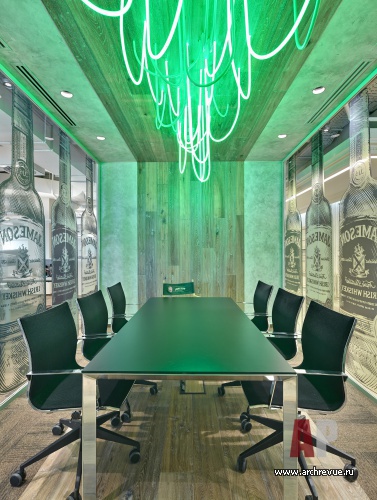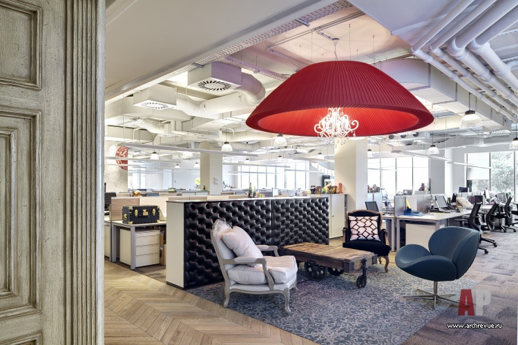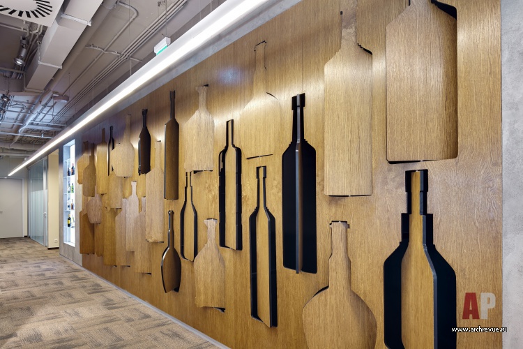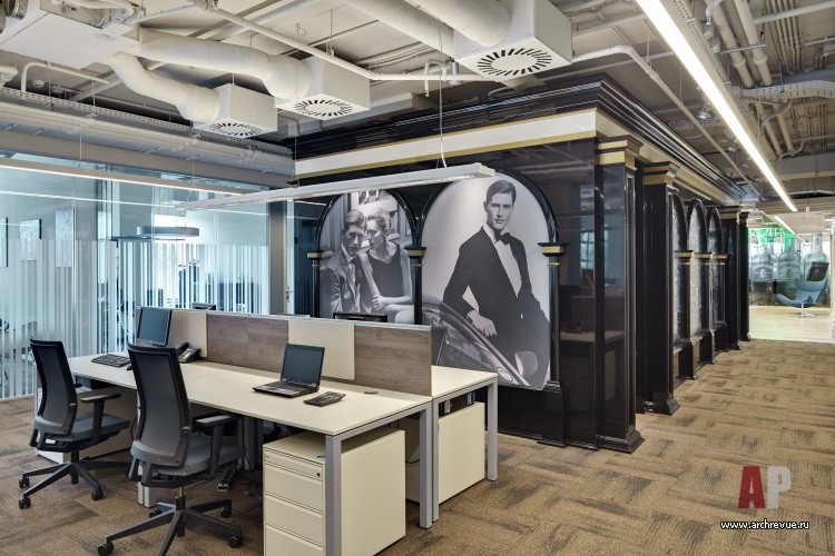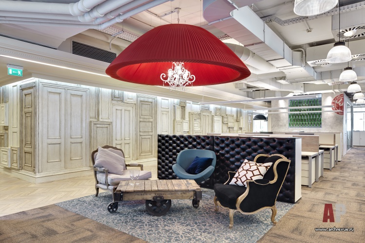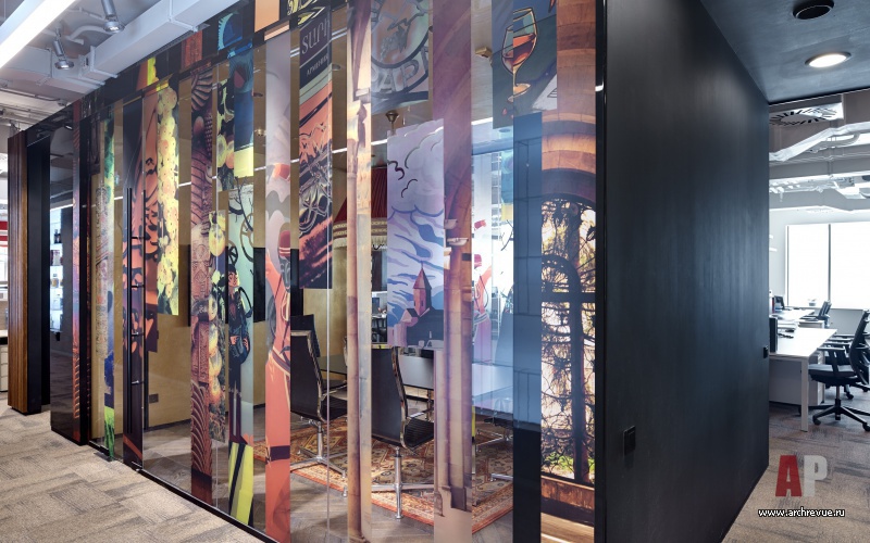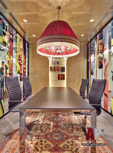 Яркая дизайнерская мебель и авангардные светильники придают атмосферу небрежного шика. Отдельного внимания заслуживает оформление четырех переговорных: каждая из них отражает стилистку одного из основных брендов компании. Первая решена как фешенебельный лондонский бутик с кожаной отделкой, вторая как старое ереванское кафе с коврами, декор третьей навеян природой Алтайского края, а четвертая напоминает брутальный ирландский паб.