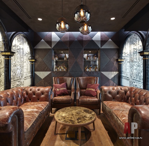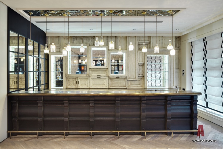 Яркий, эстетский интерьер сами архитекторы называют «французской квартирой». Выполненное в стилистике буржуазного фьюжн пространство сочетает в себе простоту и функциональность, уют и обжитую атмосферу с модными акцентами. Классический паркет «елочкой», отделка стен разноформатными кессонами из состаренного дерева, неоклассические перегородки со стеклянными витражами, отделка барной зоны рояльным лаком – все это формирует облик интеллигентного интерьера с историей.