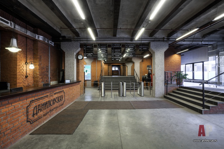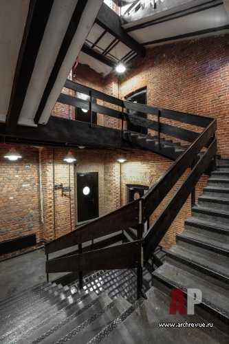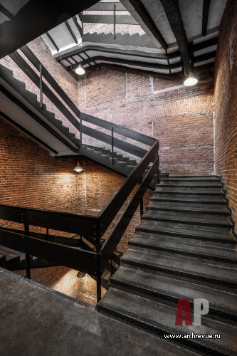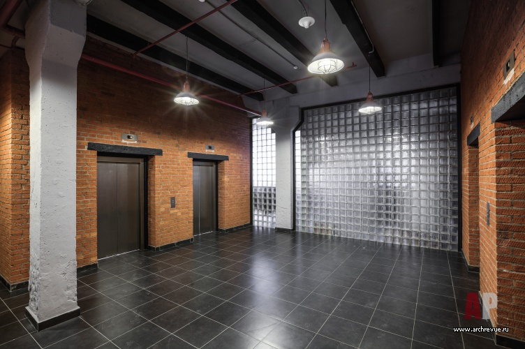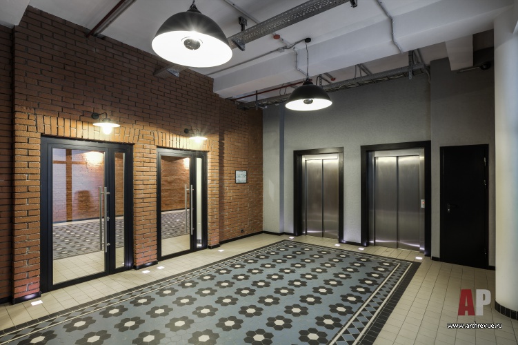 Задача оформления входных групп – максимально сохранить исторический облик здания. Красный кирпич в отделке стен, ковер из метлахской плитки, бетонные полы, лестницы из черного металла были тщательно отреставрированы и частично заменены на идентичные. Стилистика loft поддерживается мебелью из винтажной кожи и авангардными светильниками от известных дизайнеров.