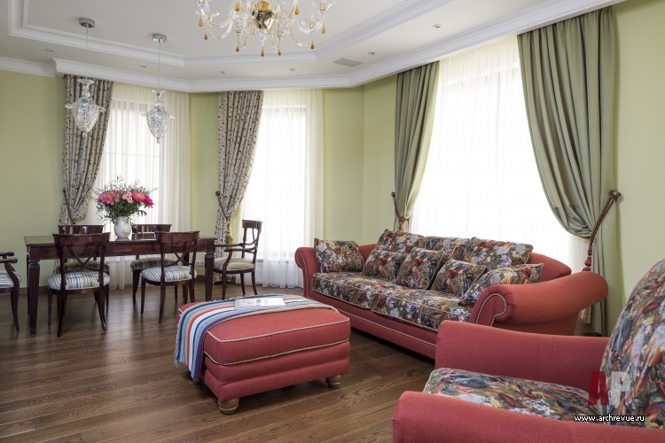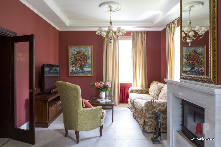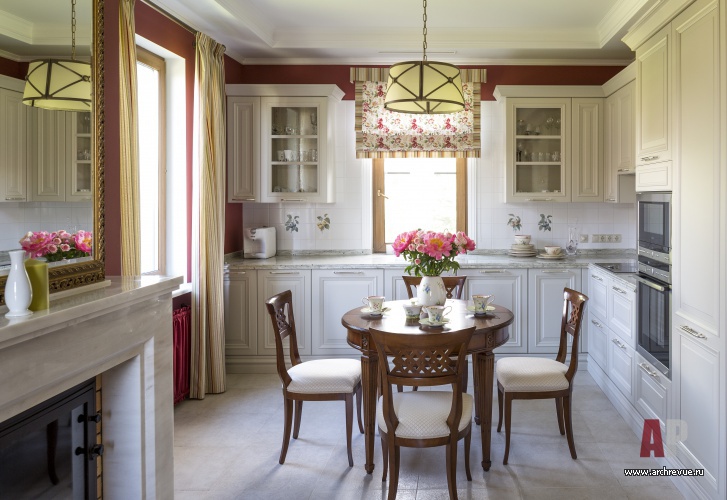 Для оформления небольших по площади посещений дома архитекторы выбрали яркую колористику, цветочные мотивы и ностальгическую стилистику с элементами стиля Прованс и кантри. Так, стена каминного зала выкрашены в насыщенный винный цвет, который зрительно расширяет помещения. С декоративными отделками стен контрастирует кухня из выкрашенного в белый цвет дерева, английская керамика с росписью на фартуке и серый гранит в отделке камина и столешницы.