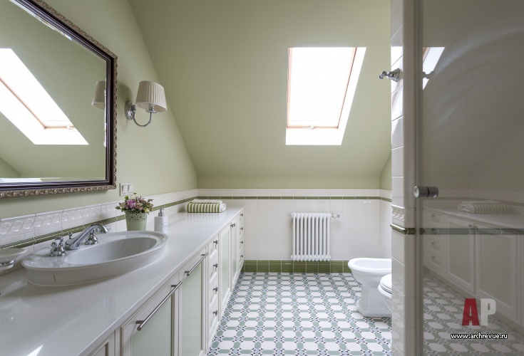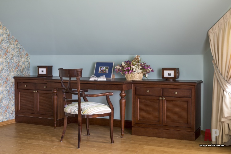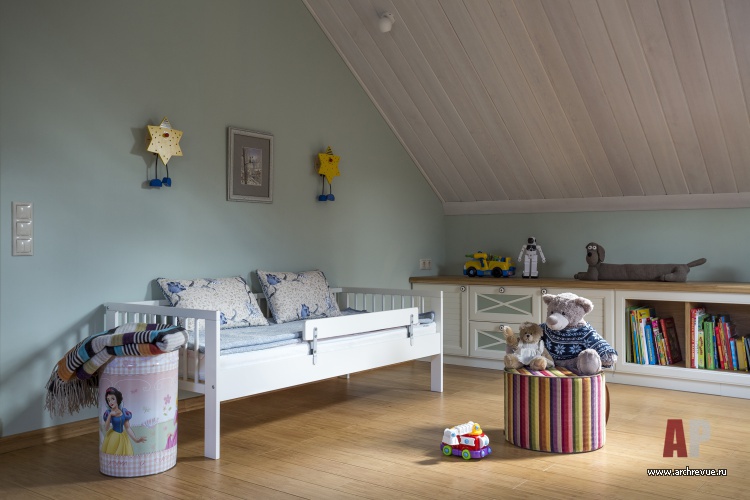 Стены гостиной выкрашены в нежный зеленый цвет, который контрастирует с темным деревом мебели. Спальня в мансарде в бирюзовых тонах решена в этническом стиле, детская с белой мебелью отсылает к стилистике Прованса.