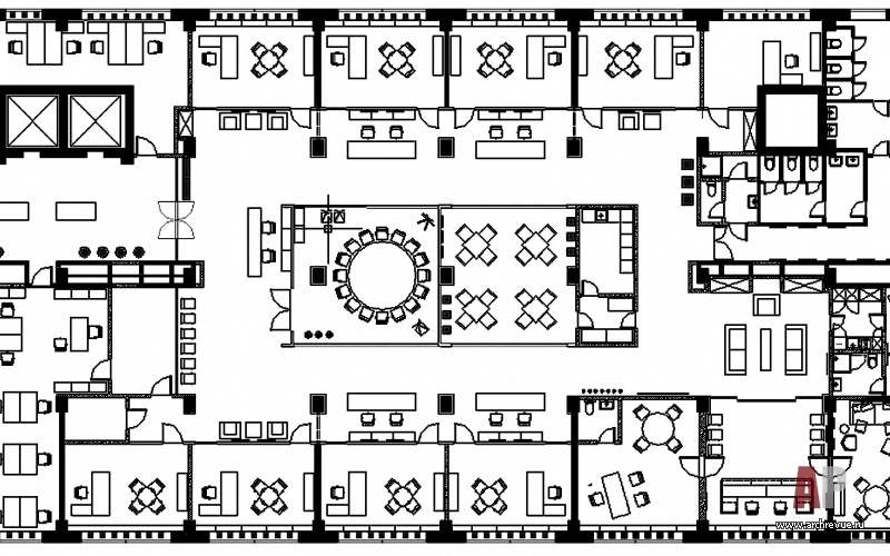 Вдоль него через круговой коридор располагаются кабинеты вице-президентов фирмы. Чтобы солнечный свет проникал в глубину помещения, все двери в кабинеты выполнены из матового стекла.