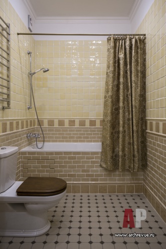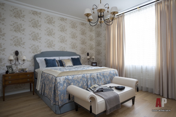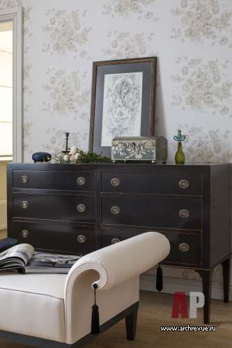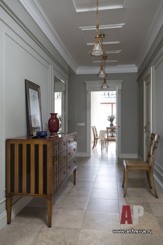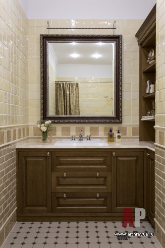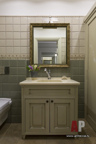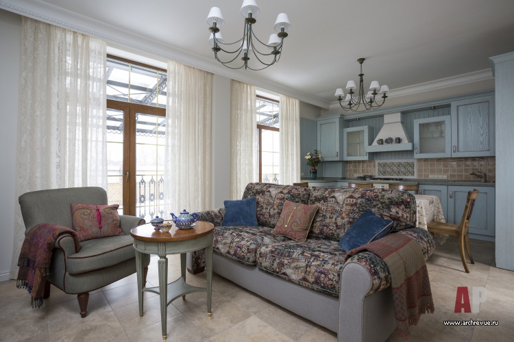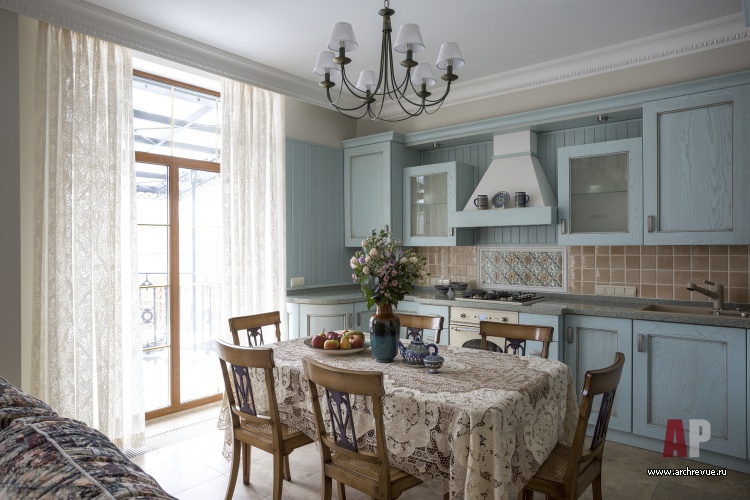 В оформлении интерьера акцент сделан на стилистику кантри. Полы и стены выглядят нейтральными: светлый дуб, керамогранит с фактурой травертина, отделка стен однотонными красками пастельных тонов не акцентируют на себе внимание и визуально увеличивают небольшие помещения. Важную роль в создании теплого и душевного интерьера играет мягкая мебель с яркой обливкой, английская керамическая плитка, кружевные шторы и скатерти, а главное – оригинальный кухонный гарнитур из брашированного дерева, с фасадами светлого серо-голубого цвета.