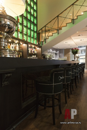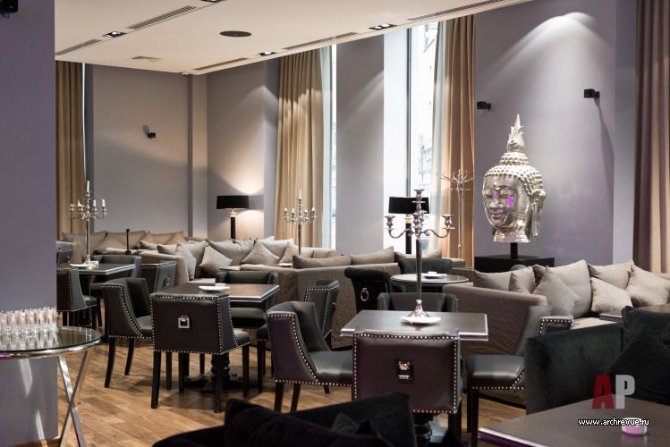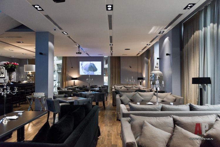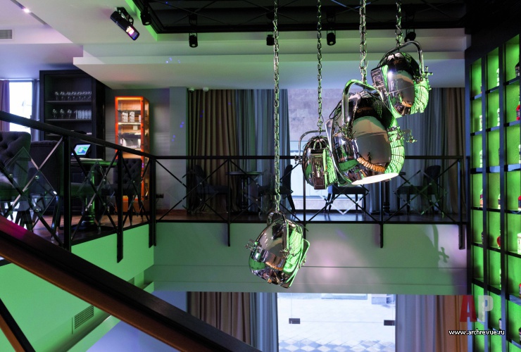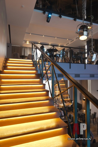 Ресторан занимает два этажа здания, вход в основной зал предваряет парадный холл с лестницей и стеклянной стеной-витражом. Посадочные места обоих этажей группируются вокруг центральной лестницы, которая связывает два уровня заведения. Вертикальная осевая доминанта – барная зона с подсветкой.