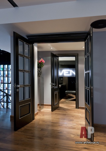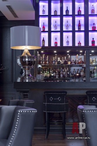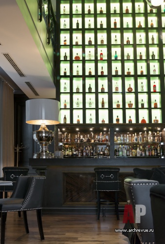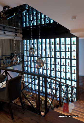 Ресторан AVENUE расположен за городом, его интерьеры выполнены в стилистике респектабельного хай-тека. Визитная карточка заведения – 10-метровая стена, обыгранная как стеллаж для хранения напитков, ячейки подсвечены динамичной подсветкой.