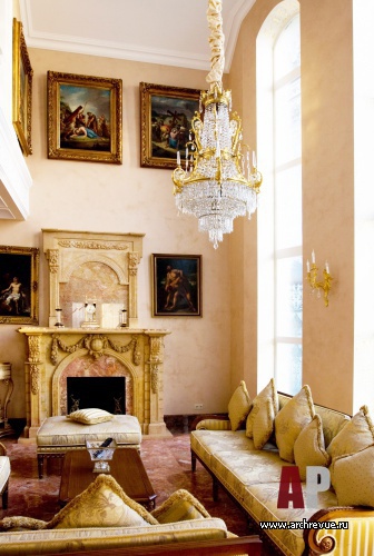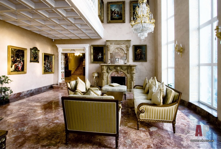 Ценные живописные полотна из коллекции хозяина служат неотъемлемой частью роскошного интерьера, превращают современный дом в старинную резиденцию.