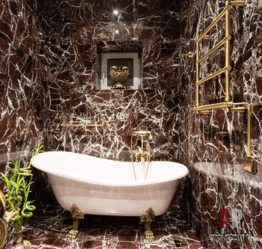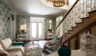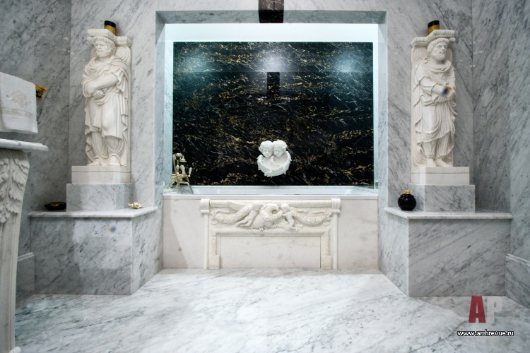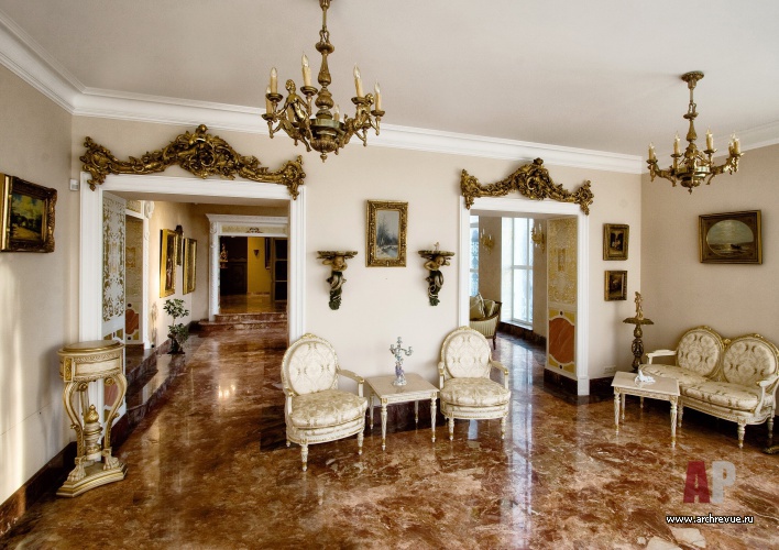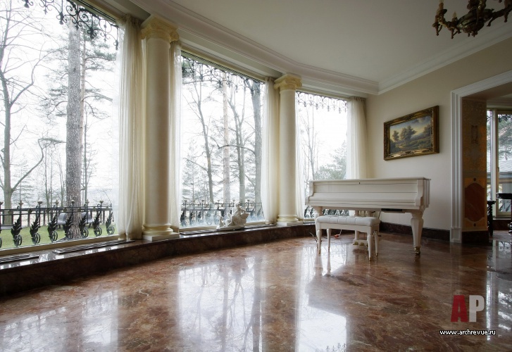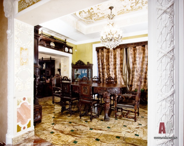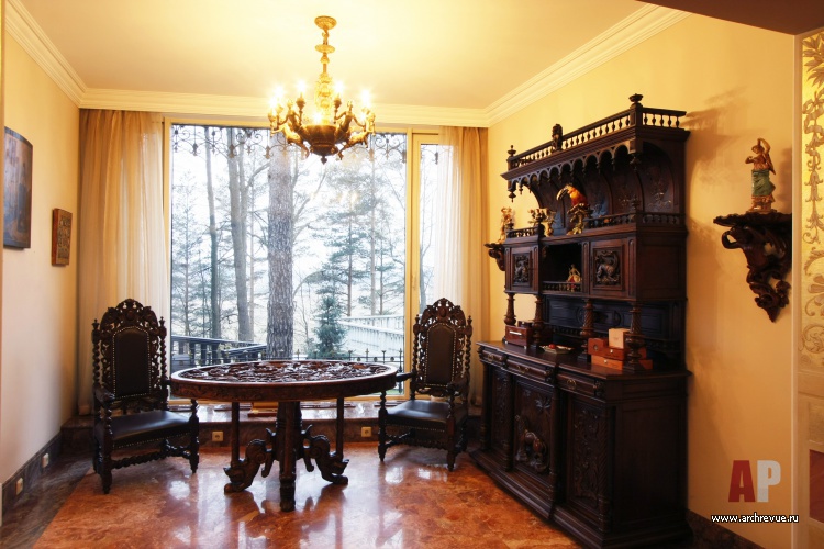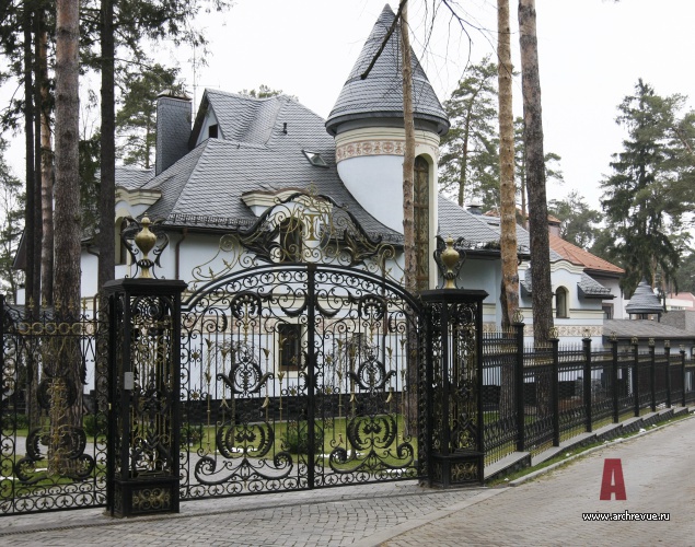 Для коллекционера старинной живописи архитекторы спроектировали дом-резиденцию в парадном классическом стиле с мраморными полами, лепными колоннами, резной мебелью и авторской росписью – интерьер авторский, многодельный и по-настоящему эксклюзивный. Трехэтажный особняк с башенками и витражами в духе дворцов австро-венгерской империи построен на каскадном участке. На территории 50 соток с высотой подъема около 20 м архитекторы разыграли много ландшафтных идей – террасные цветники, фонтан, «китайский дворик», врытый в холм гостевой дом, куда ведет каменная лестница.