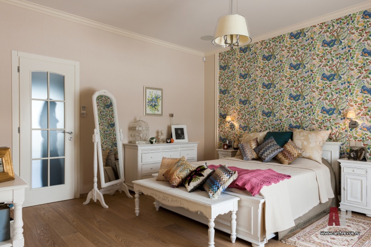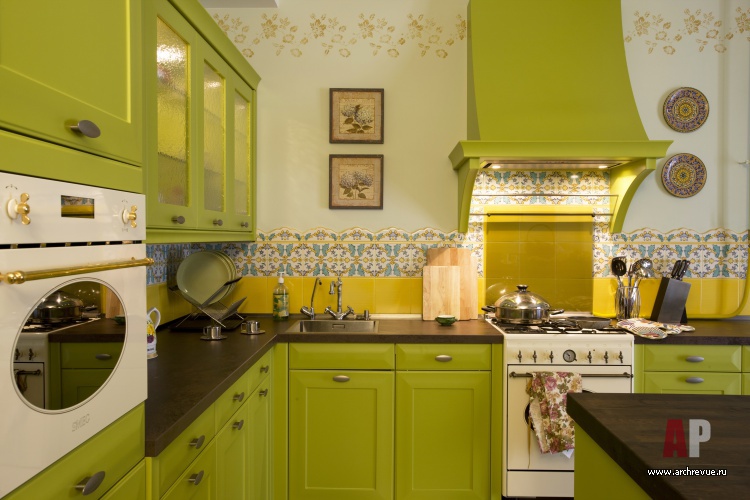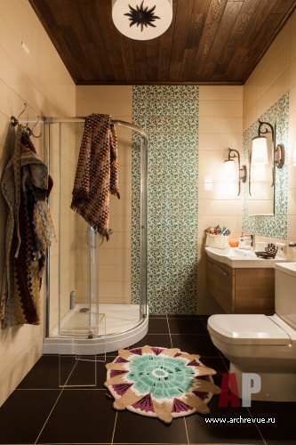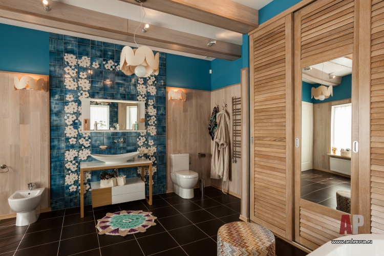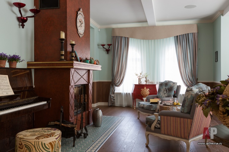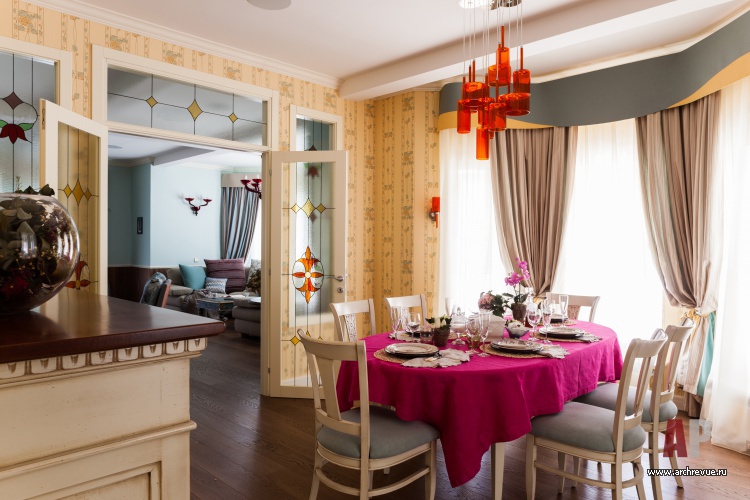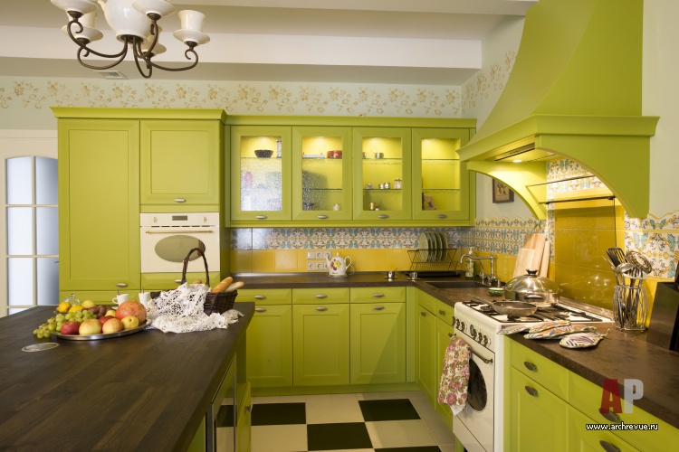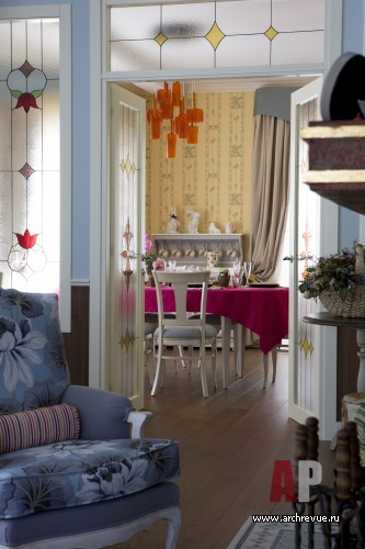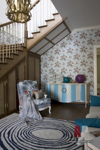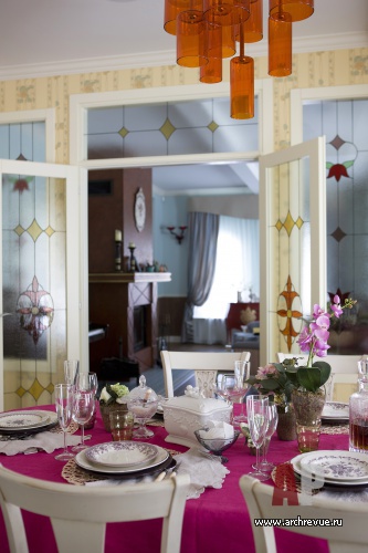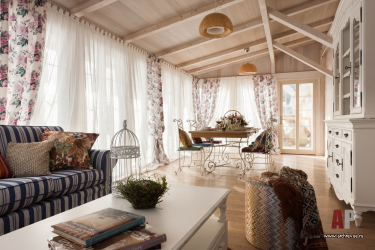 Заказчики высказали пожелание использовать в отделке дачи такие натуральные материалы, как бумажные обои с цветочным рисунком, керамическая плитка, изделия из дерева. Важную роль играет цвет: в оформлении использованы яркие салатово-зеленый, оранжевый, кобальтовый – они смиксованы с фактурой светлого дерева. Один из недостатков типового здания – чрезвычайно низко расположенные окна – дизайнер сумела скрыть благодаря использованию классических ламбрекенов.