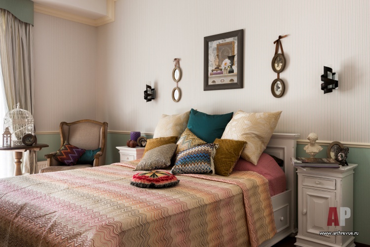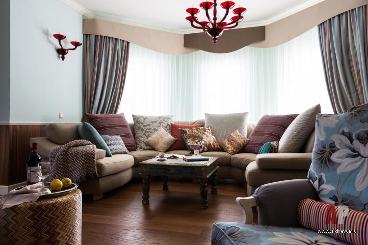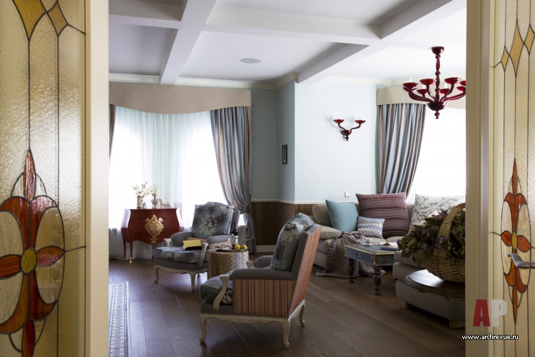 Так возникла иллюзия, что за шторами находятся высокие, но полуприкрытые декоративными драпировками окна.