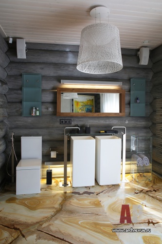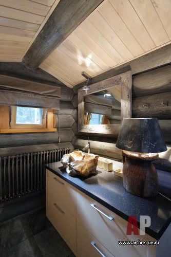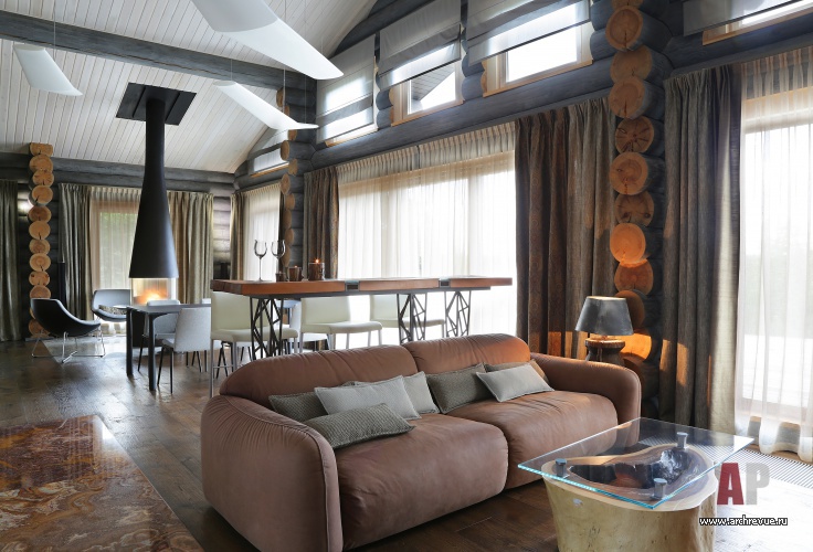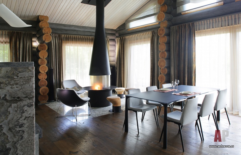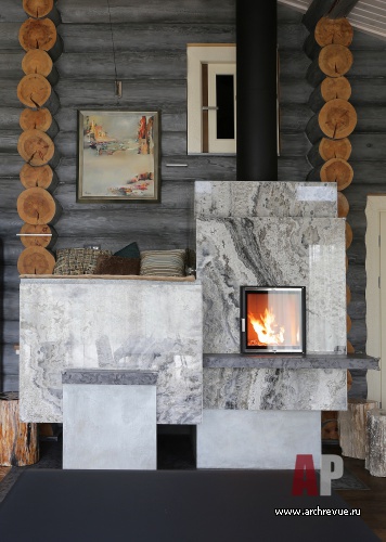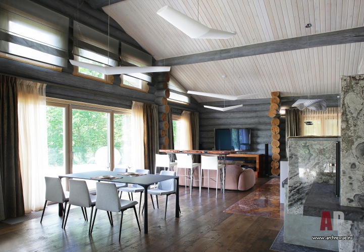 Пол в гостиной выполнен из дубовой доски с эффектом старения. Около камина сделана вставка из слэбов бразильского гранита, в зоне кухонного остова на полу слэбы из оникса. Русская печь выполнена в современном ключе по эскизам архитектора мастерами Куриными, ее фасад облицован ониксом и гранитом, нижняя часть оформлена бетоном со специальным покрытием. Двери, как и многие элементы этого дома, изготовлены по эскизам, на них совмещен кракелюр и натуральный цвет дерева. Современная мебель и светильники из последних дизайнерских коллекций завершают облик необычного деревянного дома.