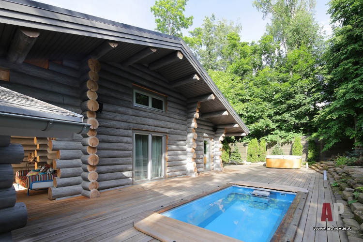Деревянный сруб простоял около двух лет, прежде чем началась внутренняя отделка: построенному из бревен 30 см в диаметре дому требовалось время для усадки. За это время вокруг дома была выстроена терраса из лиственницы со стеклянным ограждением. Край террасы нависает над деревьями, растущими на склоне. За домом находится небольшой бассейн с противотоком и гидромассажный мини-бассейн Jacuzzi.