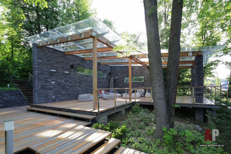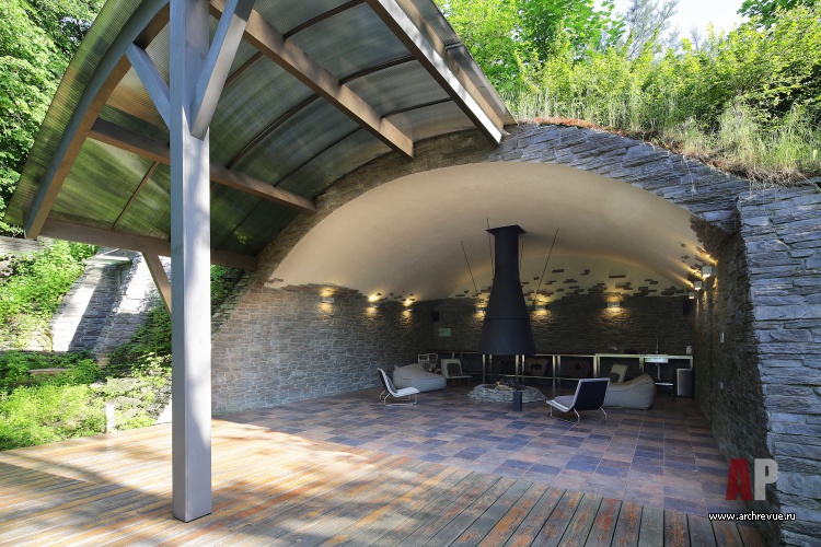 Помимо основного дома и гостевой постройки на участке создано немало интересных объектов: грот-пещера, врытая в натуральный склон, с большим очагом; большая открытая беседка со стеклянной крышей, детская площадка, лужайки, размещенный у парадного входа кусок скалы, который был привезен специально.