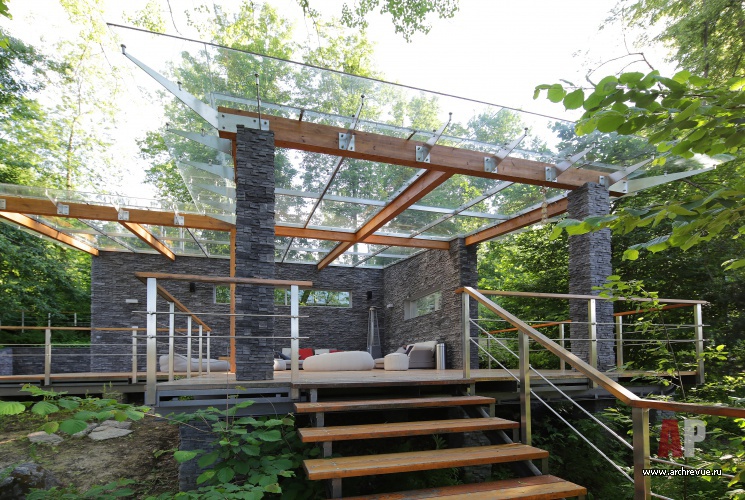 Заказчик, бизнесмен и путешественник, для отдыха с друзьями и в одиночестве хотел построить традиционный русский деревянный дом, но в современной интерпретации. Для реализации проекта он обратился к архитектору Елене Щербаковой, с которой уже имел успешный опыт совместного проектирования. Одноэтажная постройка из оцилиндрованного бревна возведена в верхней части участка со сложным ландшафтом с каскадами и перепадами уровней.