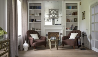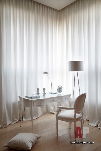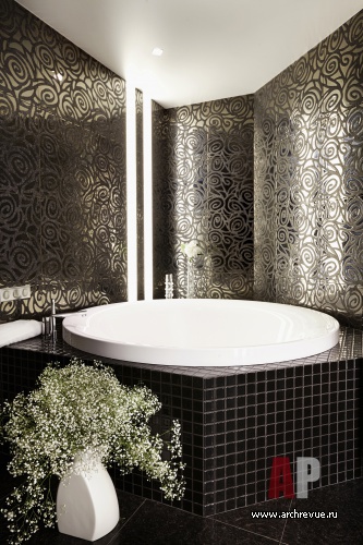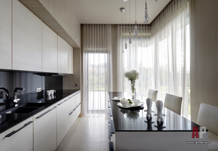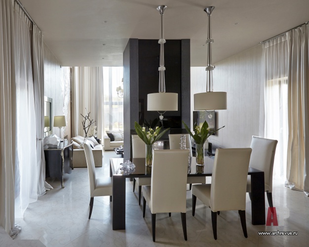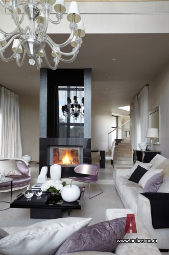 Современный характер интерьера подчеркивает строгая геометрия, натуральные отделочные материалы и лаконичная цветовая палитра с преобладанием серо-жемчужных и лавандово-лиловых оттенков. С ними контрастируют элементы из черного мрамора и антрацитового глянца – портал камина, декор фасадов кухни.