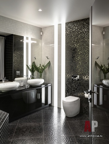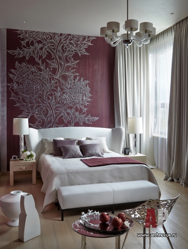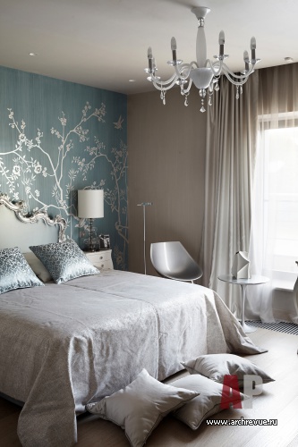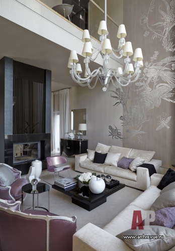 Архитекторы Ирина Мавродиева и Артур Гога создали экстравагантный загородный интерьер в серебристо-лиловых тонах. Современная архитектура дома располагала к созданию функционального пространства с открытыми просторными помещениями, стилистику в облегченного духе ар-деко с элементами гламура определила настенная роспись с изображением игуаны.