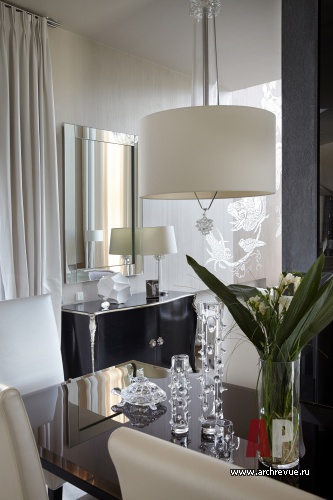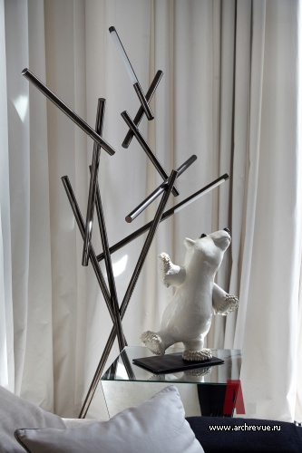 Декоративный акцент двухсветной гостиной – художественное панно на всю высоту стены с изображением игуаны: рисунок выполнен серебром по поверхности, имитирующей вельвет. Изысканный декор служит связующей нитью между лаконичными предметами в стиле ар-деко и мебелью в духе французской неоклассики.