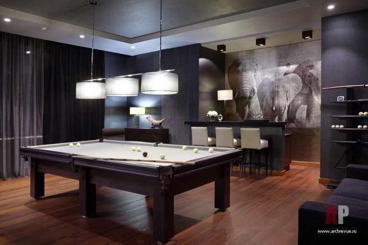 Внизу также расположена зона отдыха - затемненное помещение с бильярдной, домашним кинотеатром и баром. Верхний этаж занимают хозяйские спальни с гардеробными и ванными комнатами.