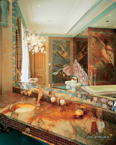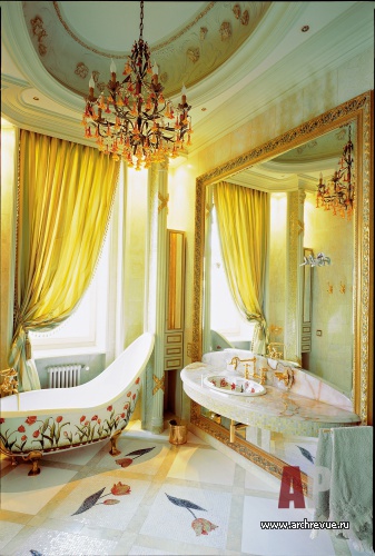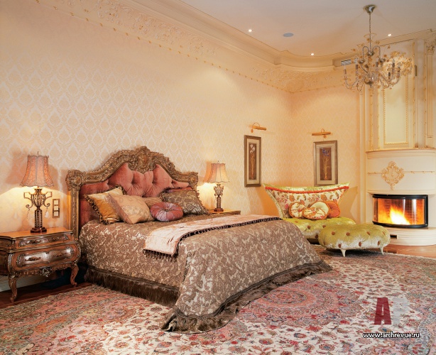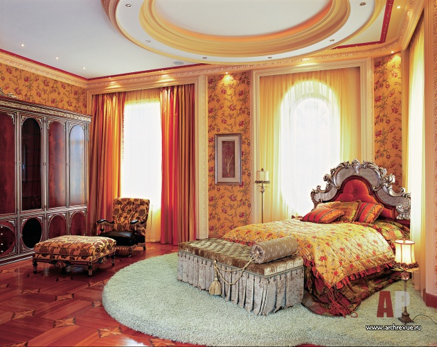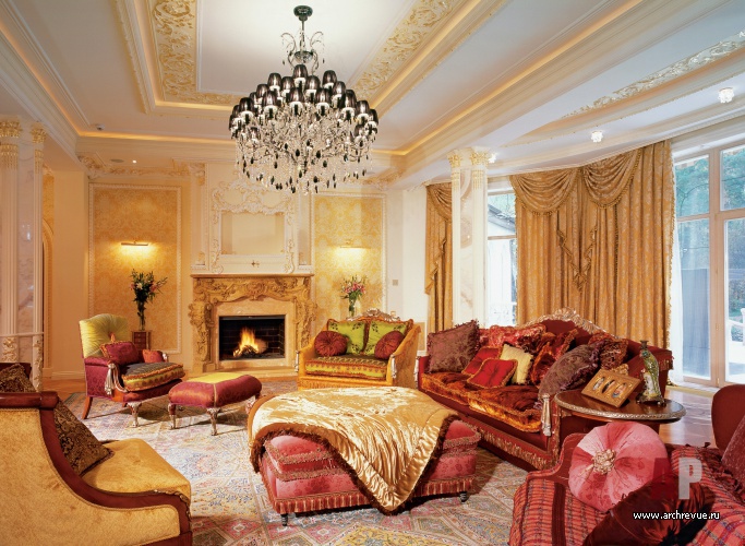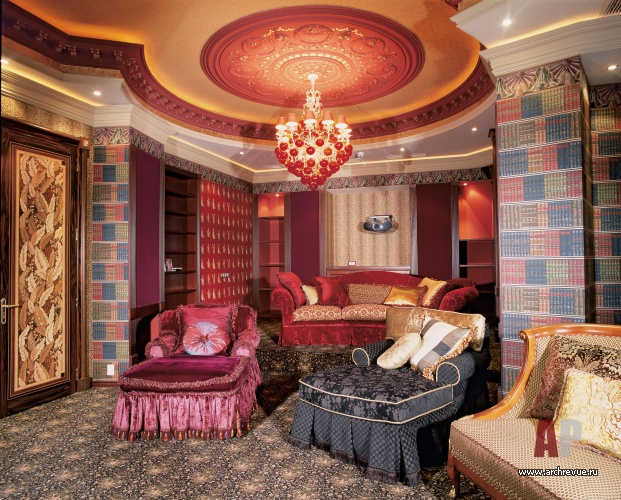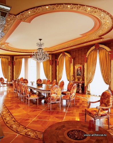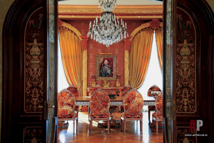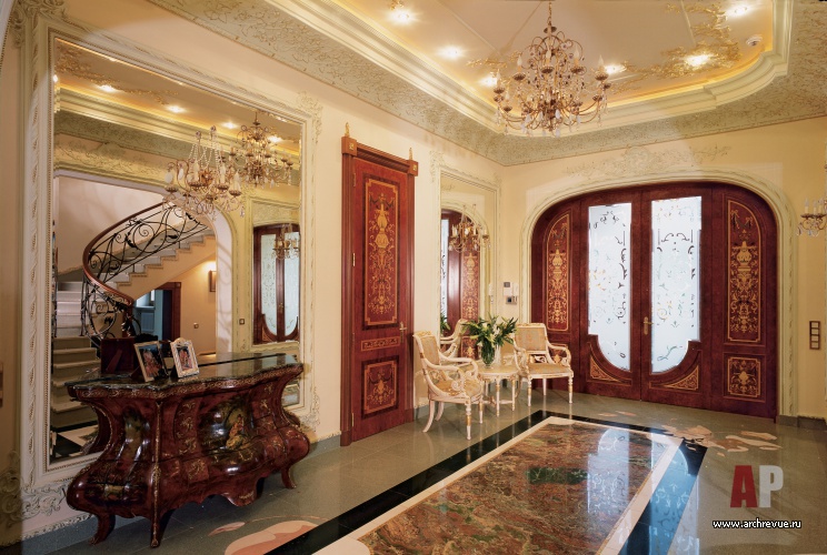 Этот поражающий роскошью дом построен для талантливой леди из мира искусств, ее яркая индивидуальность и постоянная жажда нового вдохновила художника по интерьерам Марину Путиловскую на создание сложного, многодельного и очень подробного интерьера с нетривиальными декораторскими решениями, помпезными материалами и авторскими изделиями. Сам дом, построенный по американскому проекту в одном из коттеджных поселков, полностью отвечал всем требованиям современного и комфортного загородного жилья.