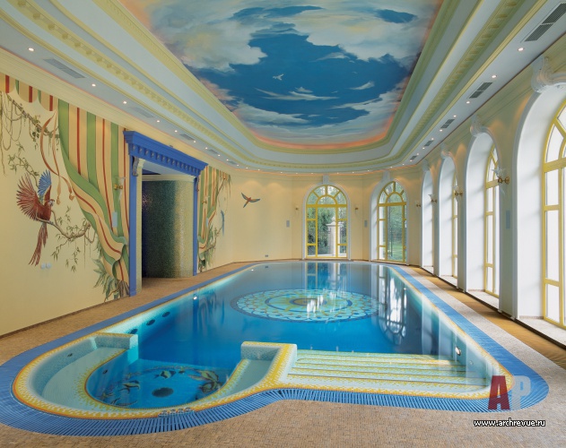 В структуру первого этажа все же были внесены изменения: так появилась зона релакса, состоящая из бассейна, сауны и SPA-центра, откуда есть выход на террасу и спуск в сад.