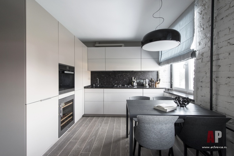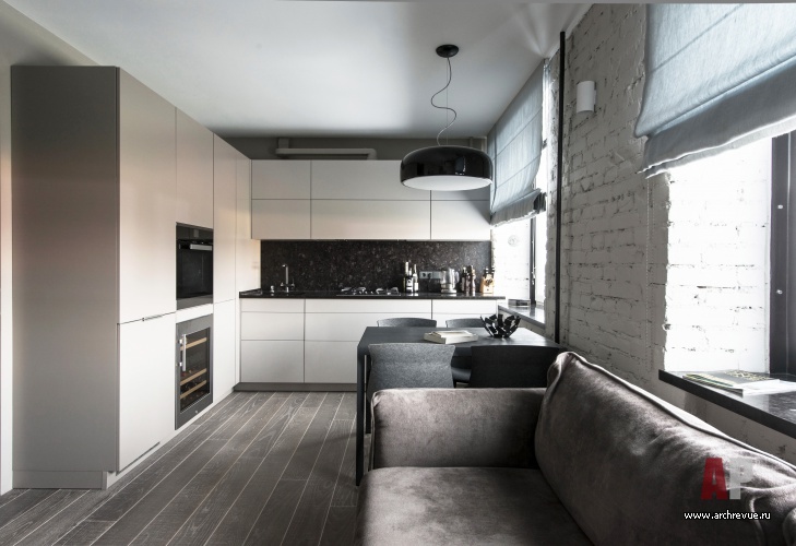 Минималистичный облик нового интерьера был во многом вдохновлен современным кухонным гарнитуром немецкой фабрики Leicht с лаконичными фасадами, сложной технической начинкой и встроенной электроникой. Кухня является частью презентационной зоны, она выстроена по двум стенам.