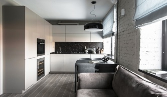 При этом нейтральная серо-бежевая гамма, большие окна, яркая обивка мебели придают интерьеру современный характер.