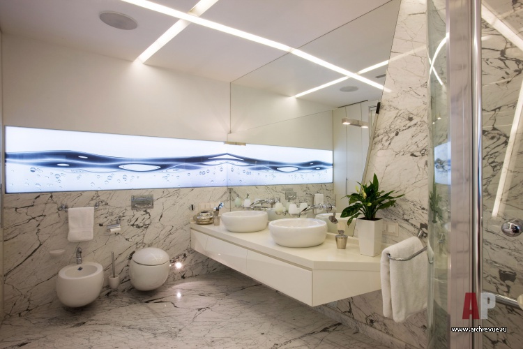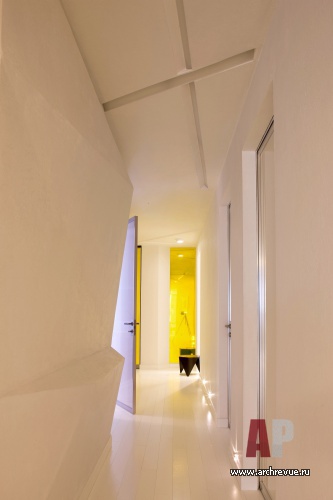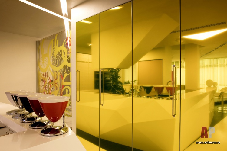 Основная идея проекта – солнечный свет, который распространяется от панорамных окон в остальные помещения. Ей, в первую очередь, служат прорезающие потолок неоновые лучи, которые расходятся по всему объему и задают ритм и пластику. А также ряд других приемов: белый цвет, обладающий отражающей способностью, перегородки и фасады кухни из теплого, желтого стекла и зеркал, светлый камень и паркетная доска в отделке полов. Футуристический облик интерьера завершает ультрасовременная мебель от ведущих мировых дизайнеров.