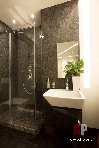 Квартира с панорамными окнами по одной стороне имеет вытянутую в плане форму, две ее стены абсолютно глухие. Ассиметричная композиция позволила уйти от традиционной в подобном случае планировки, когда гостиная размещается в зоне панорамных окон и неизбежно возникает длинный коридор, а половина квартиры остается без естественного света. Размещенный в центре пространства на границе гостевой и приватной зон гостевой санузел в виде айсберга позволил избежать скучного коридора, его архитекторы раздробили на два прохода.