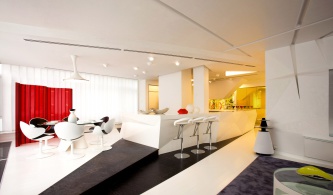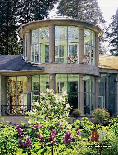 Пространственную организацию дома отличает респектабельность, уравновешенность и элегантная пластика. Симметричную композицию жилого пространства формирует расположенная по центру входная группа с прихожей, украшенной большими зеркалами, и круглым парадным холлом. От него звездой расходятся жилые помещения первого этажа: просторная гостиная, столовая с террасой, библиотека и зимний сад составляют парадную анфиладу, которая закачивается бассейном в стеклянной башне.