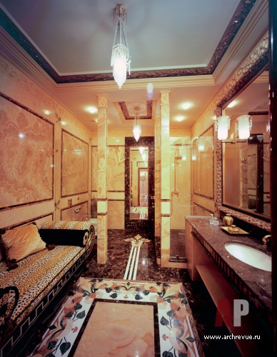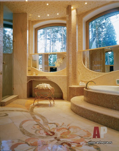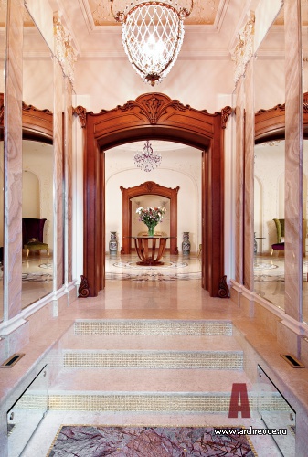 Другой маршрут ведет к каминному залу и кухне. Парадная лестница ведет в приватные апартаменты: спальни, гостевые, гардеробные и будуар хозяйки. Эффектные виды и интересные ракурсы акцентированы с помощью открытых порталов и стеклянных дверей. Эти приемы визуально обогащают интерьер, придают ему цельность и наполняют воздухом.
