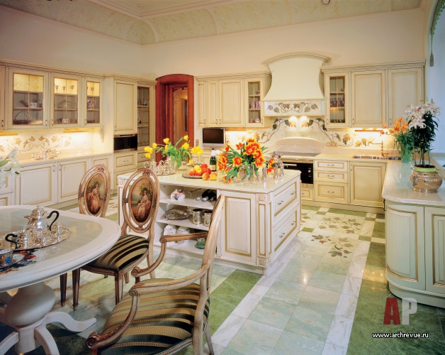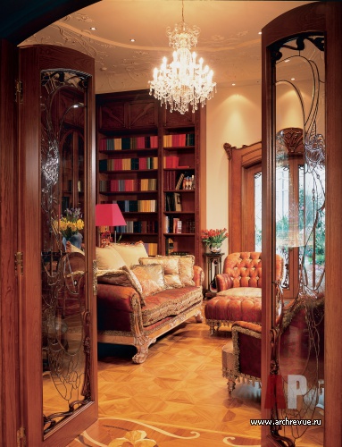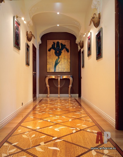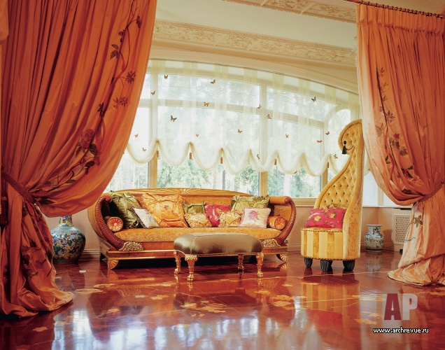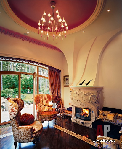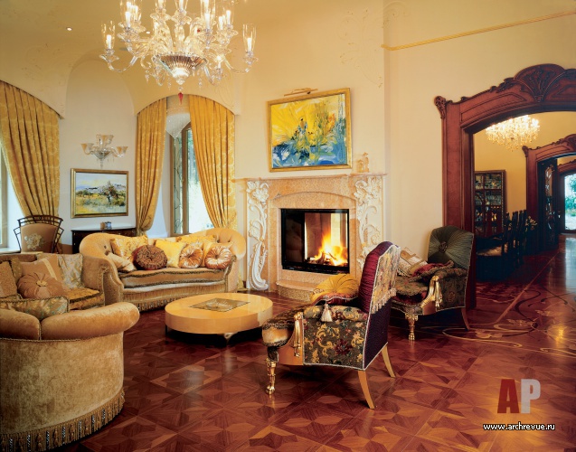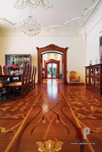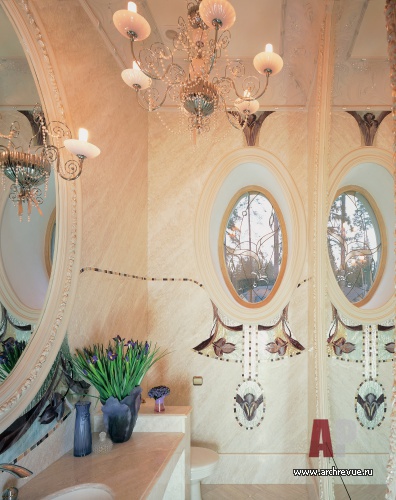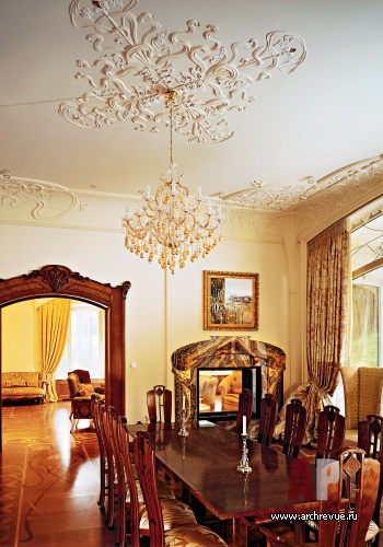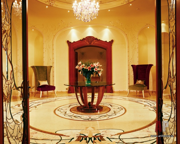 В основу концепции художественно-декоративного ряда дома лег образ ириса – любимого цветка хозяйки. Его изображение угадывается в изысканном лепном декоре, каменной резьбе каминных порталов, орнаменте художественного паркета из карельской березы и каменных панно. Поражающий роскошью интерьер выглядит легким и воздушным за счет светлой цветовой гаммы, характерной для венского модерна.