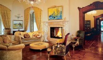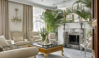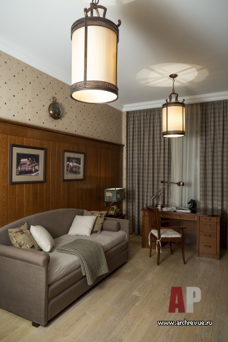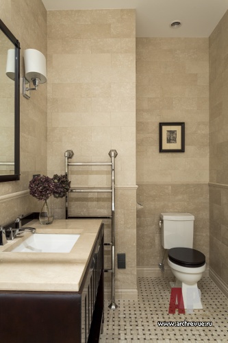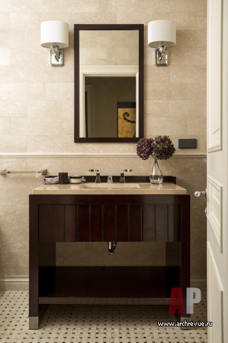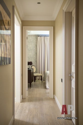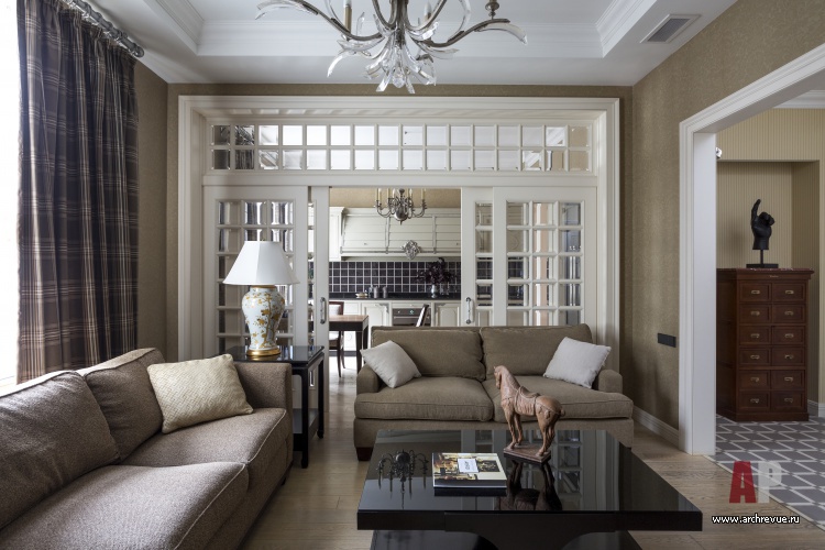 При оформлении семейной архитектор отдала предпочтение натуральным материалам: столь любимым ею природному камню и дереву, которые создают комфортную для жизни среду. Золотисто-бежевый мрамор, паркетная доска из светлого с проседью дуба рифмуется с бумажными обоями цвета топленого молока и классической орнаментикой. Визуальная доминанта интерьера общей зоны – перегородка с тонкими деревянными переплетами и стеклянными витражами с фацетом.