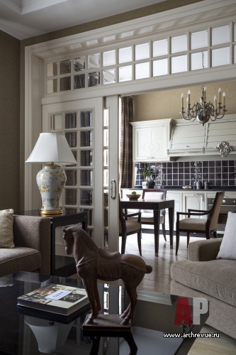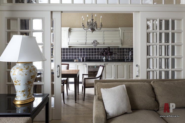 Структуру квартиры свободной планировки определило желание заказчиков сделать перетекающее пространство кухни-столовой. Эффектная перегородка с раздвижными дверями и верней фрамугой из белого дерева и стекла зонирует разные по назначению зоны, но позволяет сохранить простор и свет. Спальня и детская с блоком ванных и гардеробных расположена в глубине квартиры, к приватным помещениям от холла ведет коридор.
