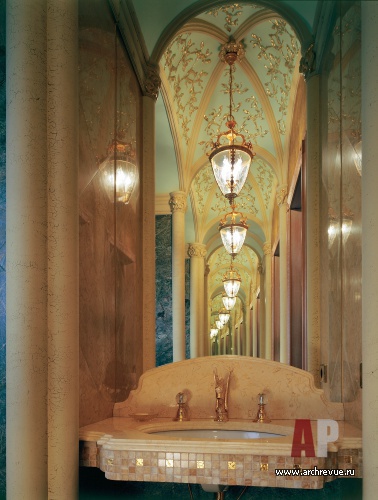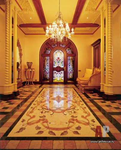 Интерьер особняка полон авторских решений и уникальных изделий. Классика подразумевает обилие орнаментов, фактур, декоративных подробностей, которые хочется изучать, рассматривать, каждый раз находя в них что-то новое. Пышный лепной декор, уникальный художественный паркет, мозаичные панно, скульптурная отделка каминов выполнены по эскизам автора проекта руками лучших мастеров своего дела.