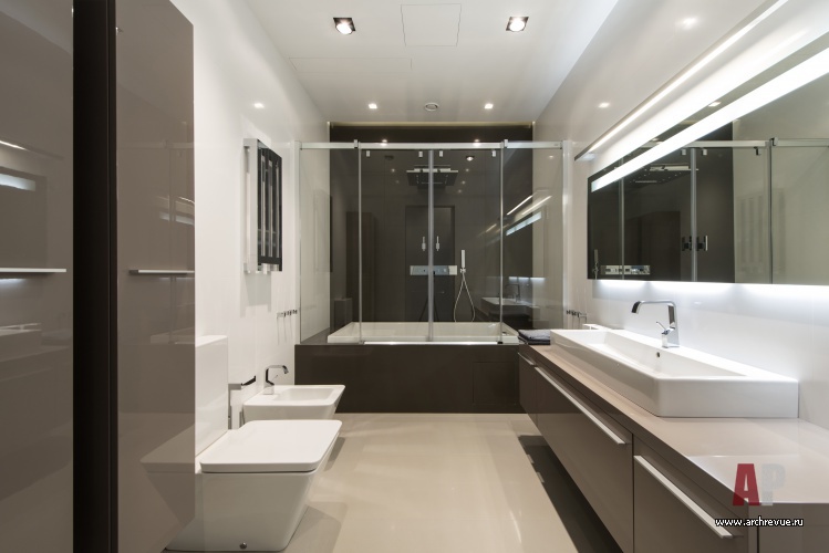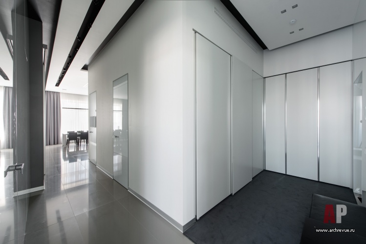 Создавая интерьер в духе уютного минимализма, архитекторы смягчают жесткость лакированных изделий и холодного камня матовыми поверхностями, теплым текстилем и отделками с приятной на ощупь фактурой. Если в гостевой части больше строгого глянца, то облик приватной формирует ковролин с плюшевой фактурой, обивка кровати с отчетливо видным переплетением нитей, матовые раздвижные перегородки.
